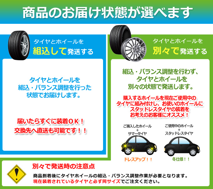 | 備考 | ■掲載以外の商品や組合せご希望の際は お問合わせ専用ダイヤル「018-845-3578」 (9:30〜18:30)にお問合わせください。 ■商品画像に関しましては実際より色具合等が多少異なる可能性がございますのでご了承ください。 ■恐れ入りますが、タイヤ製造年週の指定は致しかねます。 何卒ご理解のほどお願い申し上げます。 製造年週に関してはお気軽にお問い合わせください。 ■実店舗にて装着する場合は別途工賃を頂戴致します。 ■おすすめ車種に掲載されている車種でも年式・型式・グレード等によっては装着不可の場合もございます。 |