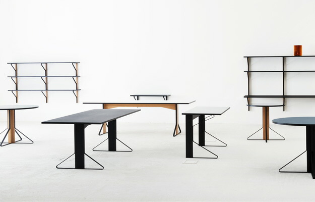 それぞれ2つのサイズの長方形と円形テーブル以外に、カアリ・コレクションにはデスク、大小2種のサイズの壁付け棚、小サイズの円形壁付け棚があります。素材だけでなく、システムという概念もアルテックの歴史において非常に重要視されています。テーブル、椅子、スツール等の様々なものを支えるためにアアルトが開発したL -レッグのシステムと同様、ロナン & エルワン・ブルレックは木製部品とスチール製部品を組み合わせて円形テーブル用の脚、長方形テーブル用のシンメトリーな翼型をした脚、デスクを片側で支える翼型の脚を作りました。同様の原理は壁付け式のテーブルや棚にも適用されています。カアリは、アルテックの伝統を重んじながらも、独自の美を見出し、これまでのアルテックの名作とは別の存在感を放っているのです。