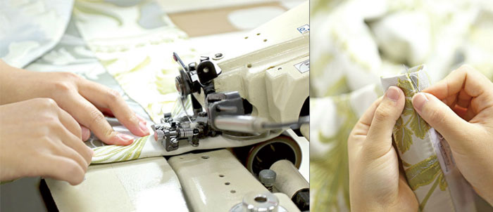 厳しい自社基準による徹底した品質管理を経て織り上がったファブリックの最終工程では、カーテンを最も美しく魅せる巾継ぎや手まつりなど、細部にこだわりながら、ひとつひとつ技術者が手作業で丁寧に縫い上げていきます。歴史と文化、技術の継承により育まれてきた本物だけが放つ美しさと、満足できる仕上りを実感していただけます。ぜひ、手に取ってお確かめください。