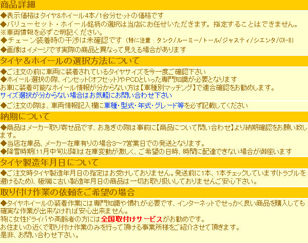 | ホイールサイズ詳細 【納期情報】 ※バリューセット内容ご確認 【ホイールサイズ】 【取り付けナット】 ※バリューセット特記事項 【送料一部地域加算】 |