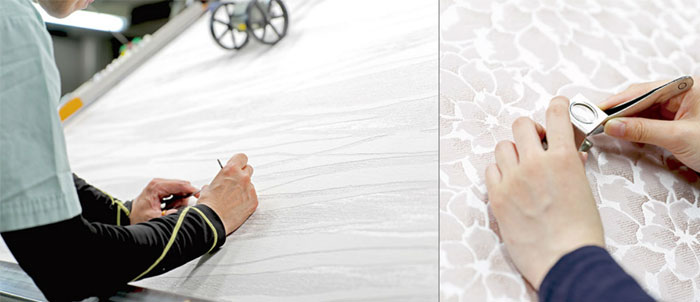 厳しい自社基準による徹底した品質管理を経て織り上がったファブリックの最終工程では、カーテンを最も美しく魅せる巾継ぎや手まつりなど、細部にこだわりながら、ひとつひとつ技術者が手作業で丁寧に縫い上げていきます。歴史と文化、技術の継承により育まれてきた本物だけが放つ美しさと、満足できる仕上りを実感していただけます。ぜひ、手に取ってお確かめください。