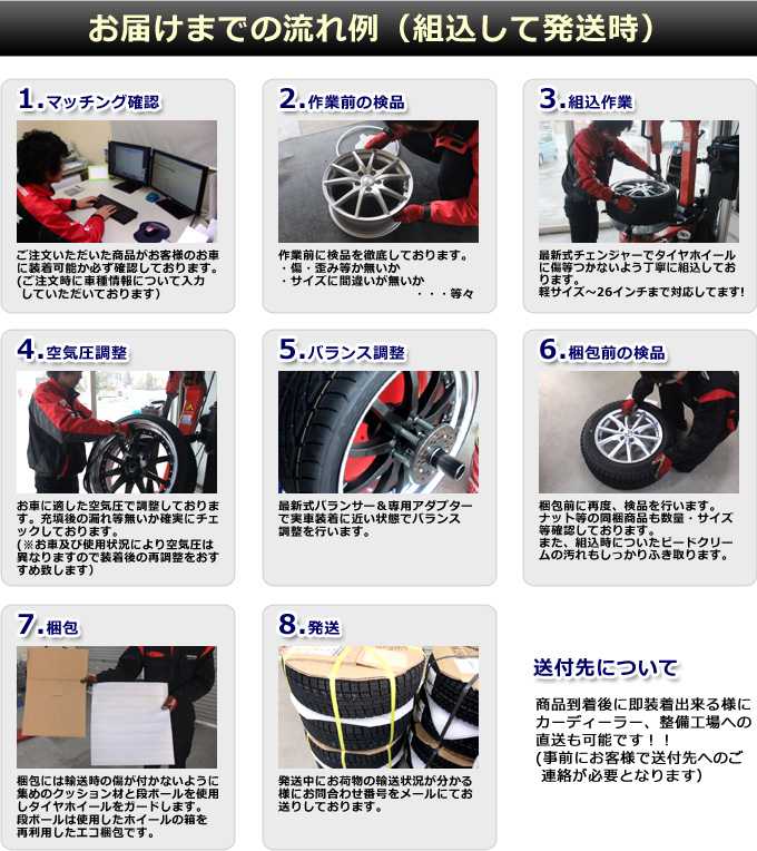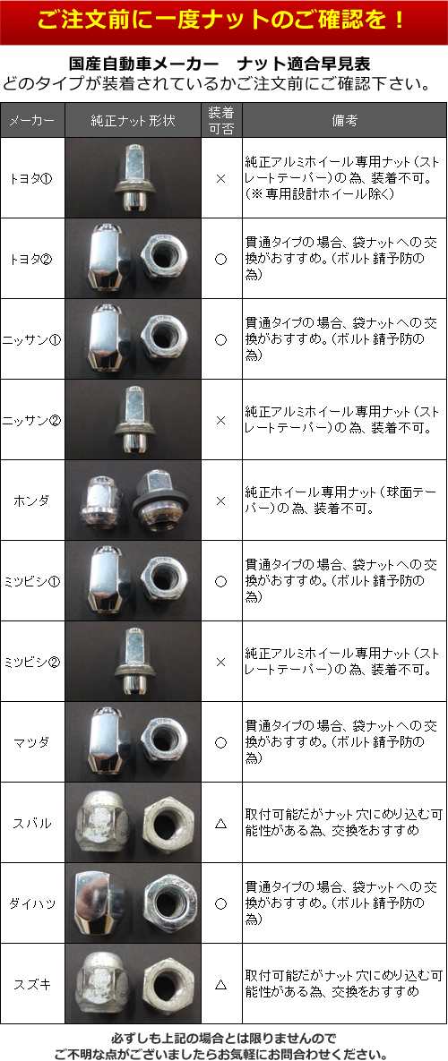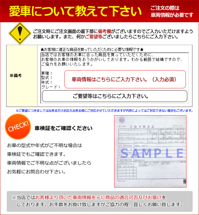 | ご注文時の お願い | ■ご注文の際に、ご注文フォームの備考欄にある「車種名・年式・型式・グレード 等」を必ずご入力下さい。 車種により適合可否及びサイズ等が異なる為、出荷が出来ない可能性がございますのでご協力の程、宜しくお願い致します。 ■ご連絡先は出来るだけ連絡の取りやすい携帯電話等の連絡先をご入力下さい。 ■ご注文後に送られる「ご注文ありがとうございます」のタイトルのメールを必ずご確認下さい。当店より出荷予定日・納期等をご連絡させていただきます。 ■タイヤサイズ等に間違いが無いかご注文を確定される前に再度ご確認下さい。 |