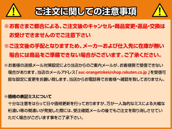 お客様のご都合(数量間違いや型番・適合間違いも含む)による商品のキャンセル・交換・返品は一切承ることが出来ません。ご注文の際は慎重にお選びの上、ご注文願います。