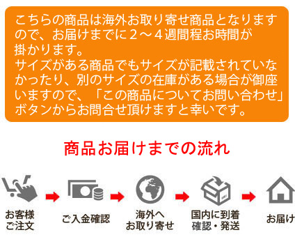 | 配送について | こちらの商品は海外からのお取り寄せ商品となっておりますので、お客様の元へお届けするまでに通常ですと2〜4週間程お時間を頂いております。 |