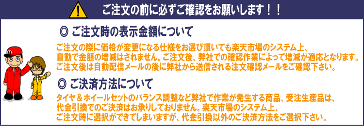 | 【注意事項】 | 御注文をいただける際には装着可否もございますので装着予定の車種、グレード、年式、型式、をご入力下さいませ。 ● 通信販売お取扱店舗 矢東タイヤ杉並店(TEL:03-3247-3811) お電話でのお問い合わせは上記店舗宛てにお願いします。 ※ こちらの商品は代金引換でのお支払いはお承りしておりません。代金引換以外のお支払い方法をご選択下さい。 ● 店頭にご来店頂いての取付作業も可能です。作業工賃は別途発生します。詳しくは各店舗へと直接お問い合わせ下さい。 <車検対応について> 製品のご使用はユーザー様の責任において道路運送法の保安基準の合致内容をご理解の上ご使用ください。 ※掲載写真は商品イメージです。サイズ、仕様により現品と異なる場合がございます。 |